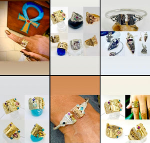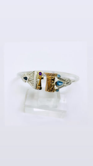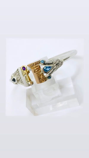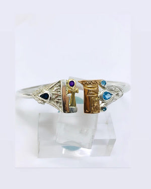 Sterling Silver bangle with Throne of Ast and 14k yellow gold ankh. On the other end of the bangle is The Bowl and Column of Nbt-Ht in 14k rose gold. Your birthstone is placed in the Ankh and 4 extra gemstones are added to the lotus flowers. Depending on stones required, the price may vary.